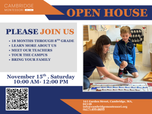 Cambridge Montessori School is an independent non-profit school educating students aged 18 months to 14 years. Located in the heart of Cambridge Massachusetts, Cambridge Montessori School is a vibrant, collaborative community of passionate teachers, joyful students, and engaged parents. Our diverse community reflects the city and world in which we live.